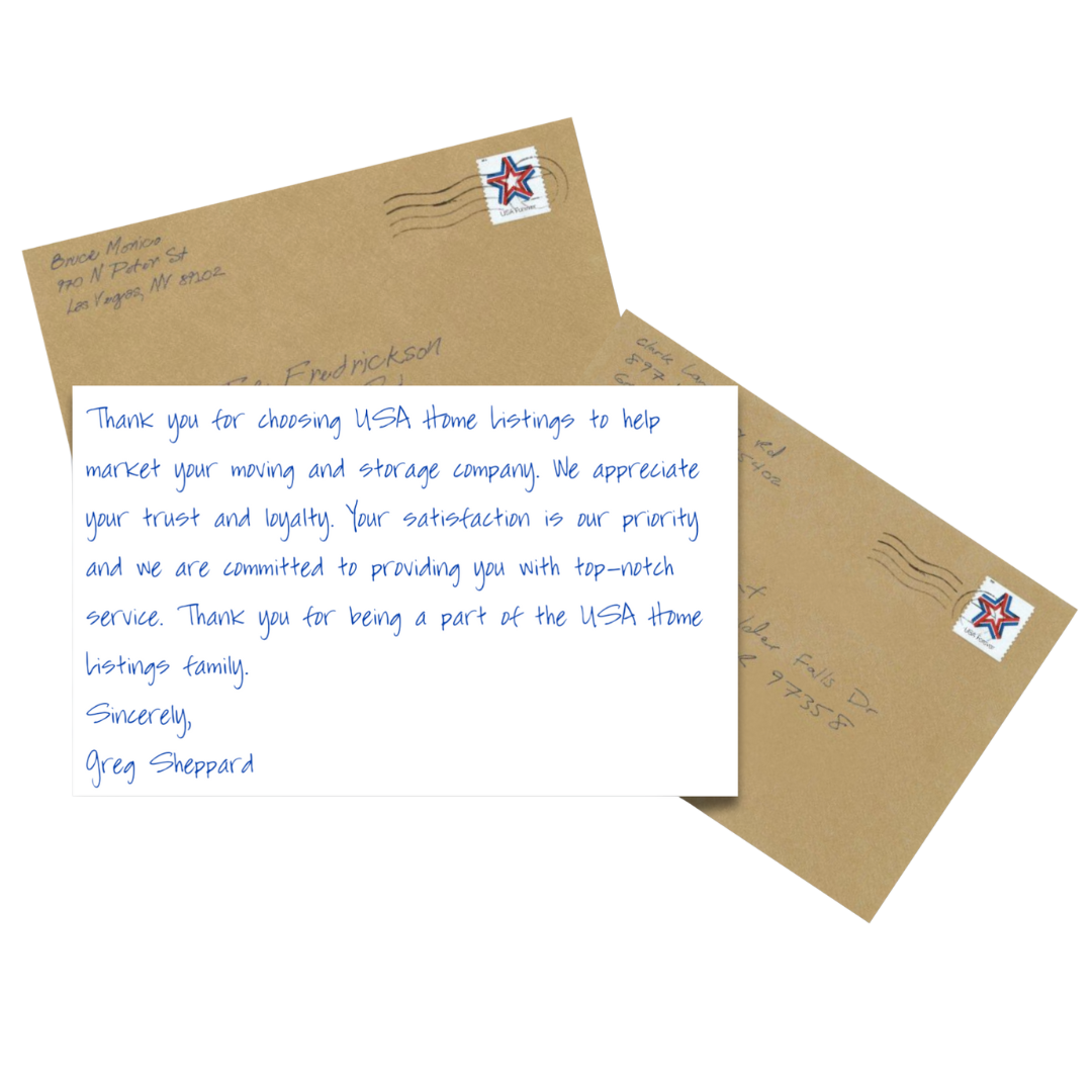 Most moving companies lack the time and consistency to mail daily, but USA Home Listings automated services ensure custom letters and postcards are sent to your customers every day—effortlessly and reliably.
